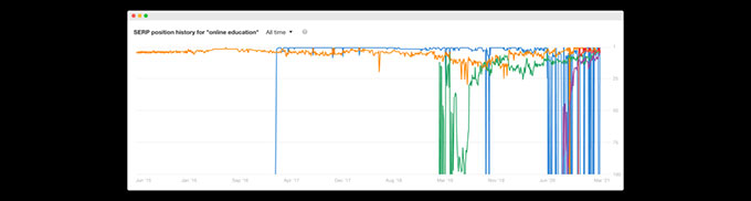 根据Animalz内容营销基准报告,教育科技网站同期平均增长超过 70% 。如果我们查看通用术语“在线教育”的排名,我们可以看到这种趋势对 SERP 的影响。经过多年的稳定,事情在 2020 年年中变得不稳定: