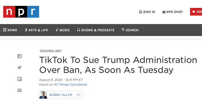 此外NPR获悉,诉讼将认为特朗普总统签署的行政令违反宪法,因为这没有给该公司一个回应的机会。据消息人士表示,TikTok还认为,特朗普政府在这项行政命令中所援引的“国家安全理由”是毫无根据的。